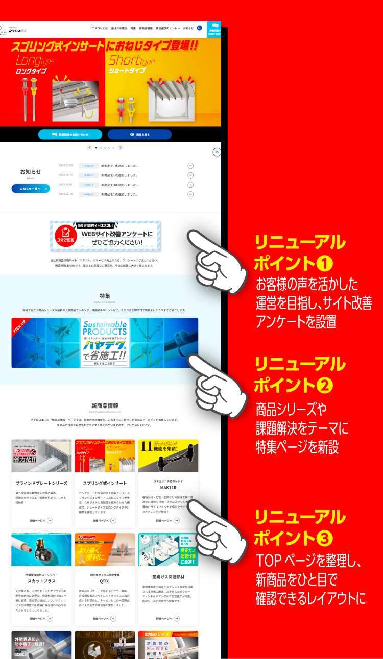 ❷商品シリーズや課題解決をテーマに特集ページを新設