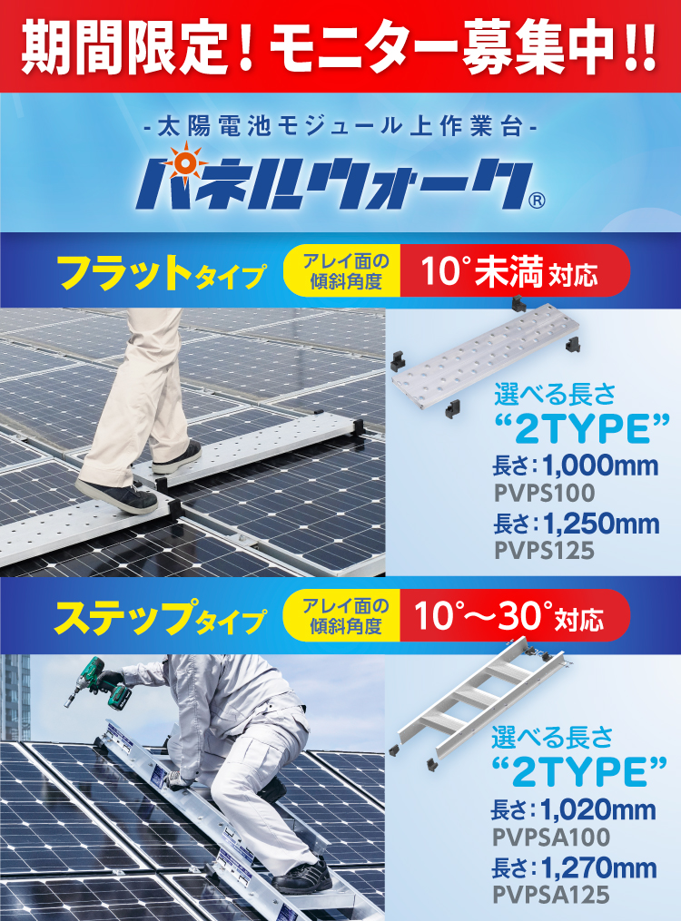 ステップタイプ アレイ面の傾斜角度:10°~30°対応 品番:PVPSA100/PVPSA125(ロングタイプ) 長さ:1,020mm/1,270mm(ロングタイプ) 適合モジュール:短辺幅750~1,000mm/短辺幅1,000~1,250mm(ロングタイプ) ▶詳しくはコチラ